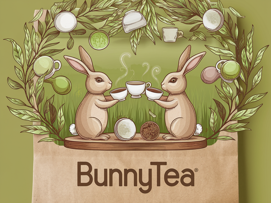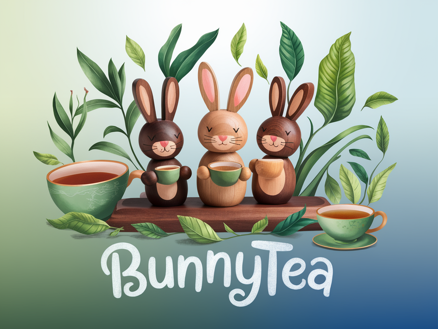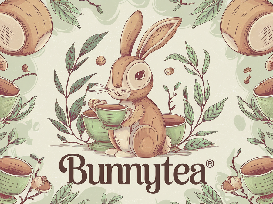 Promt: Create a design for an eco shopper that captures the essence of tea and wooden bunny figurines. The artwork should prominently feature playful illustrations of wooden bunnies surrounded by various tea leaves and tea cups, all rendered in a charming and whimsical style. Incorporate earthy tones to emphasize the eco-friendly aspect of the shopper and consider adding the phrase «BunnyTea» in a stylish, eco-conscious font.