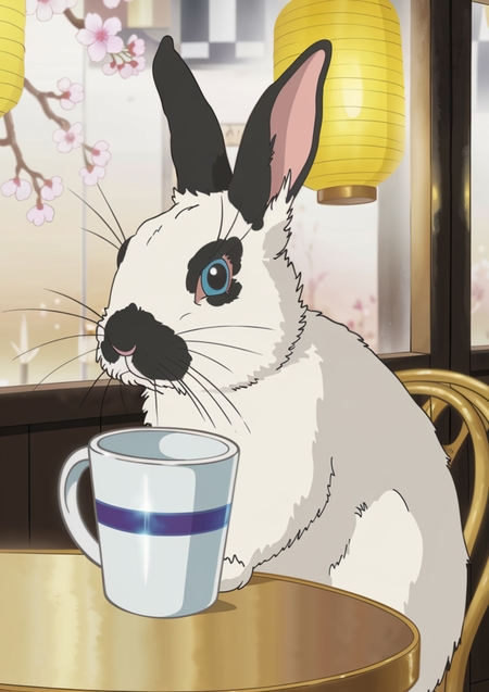 Prompt: Create a captivating book cover featuring a white rabbit with black ears and striking blue eyes, sitting at a quaint café table. The rabbit is delicately perched beside a white and blue mug of magical tea, surrounded by an enchanting atmosphere. The scene should be illustrated in the style of traditional Japanese art, capturing intricate details and vibrant colors, evoking a sense of wonder and tranquility. The background should include elements typical of a Japanese café, such as soft lanterns or cherry blossom branches, enhancing the whimsical nature of the illustration.