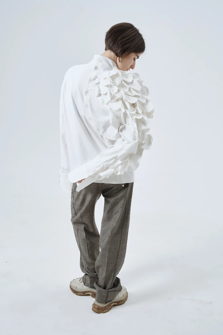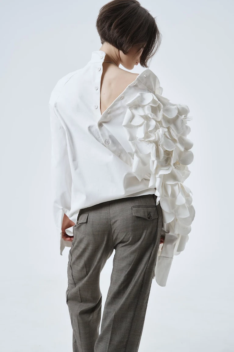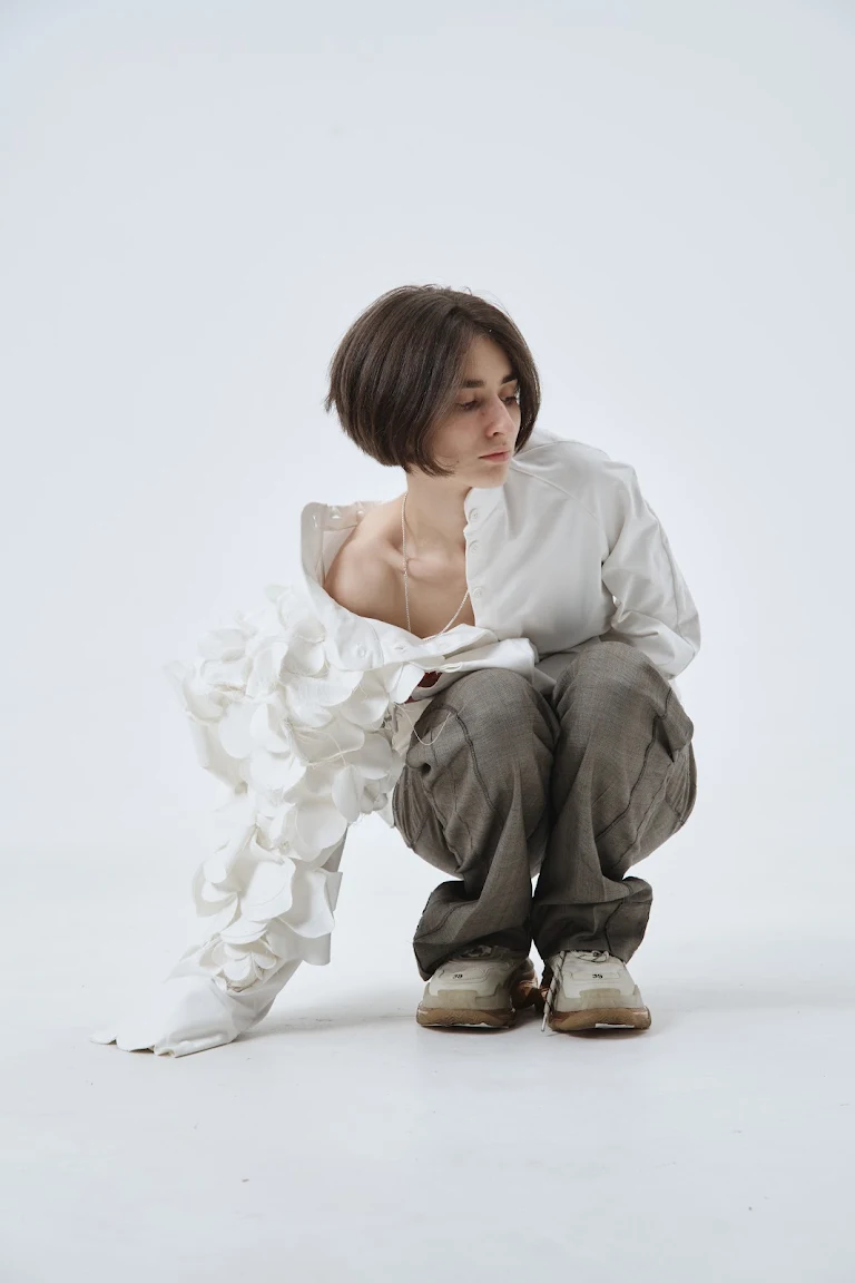 My research is based on the lens of a biologist, comparing inanimate and living nature, based on corals, since it is difficult to describe their state — inanimate or animate. Inspired by the diverse, vibrant shapes, I juxtapose them with unnatural symmetry, designing a pattern. Based on the idea of heterogeneity, the shirt is divided into two contradictory parts. The silhouette of the shirt should be as loose as possible and hide the girl’s body, following the main features of the brand. The use of raw edges, protruding threads, in parallel with neat hand embroidery, complements the concept of contrast. These two parts are combined in one product, they can separate, but they cannot live different lives.