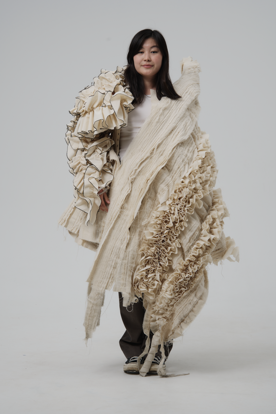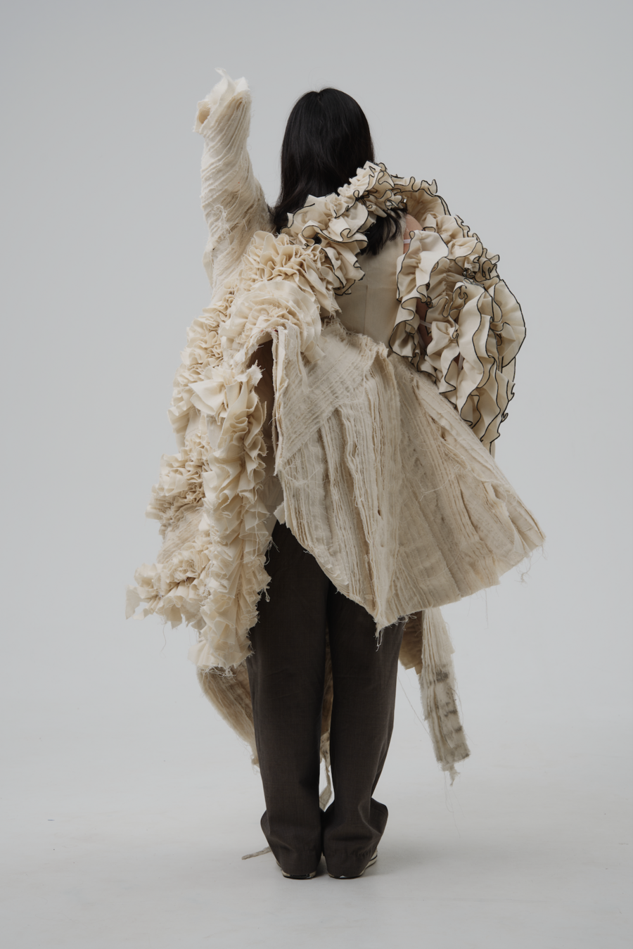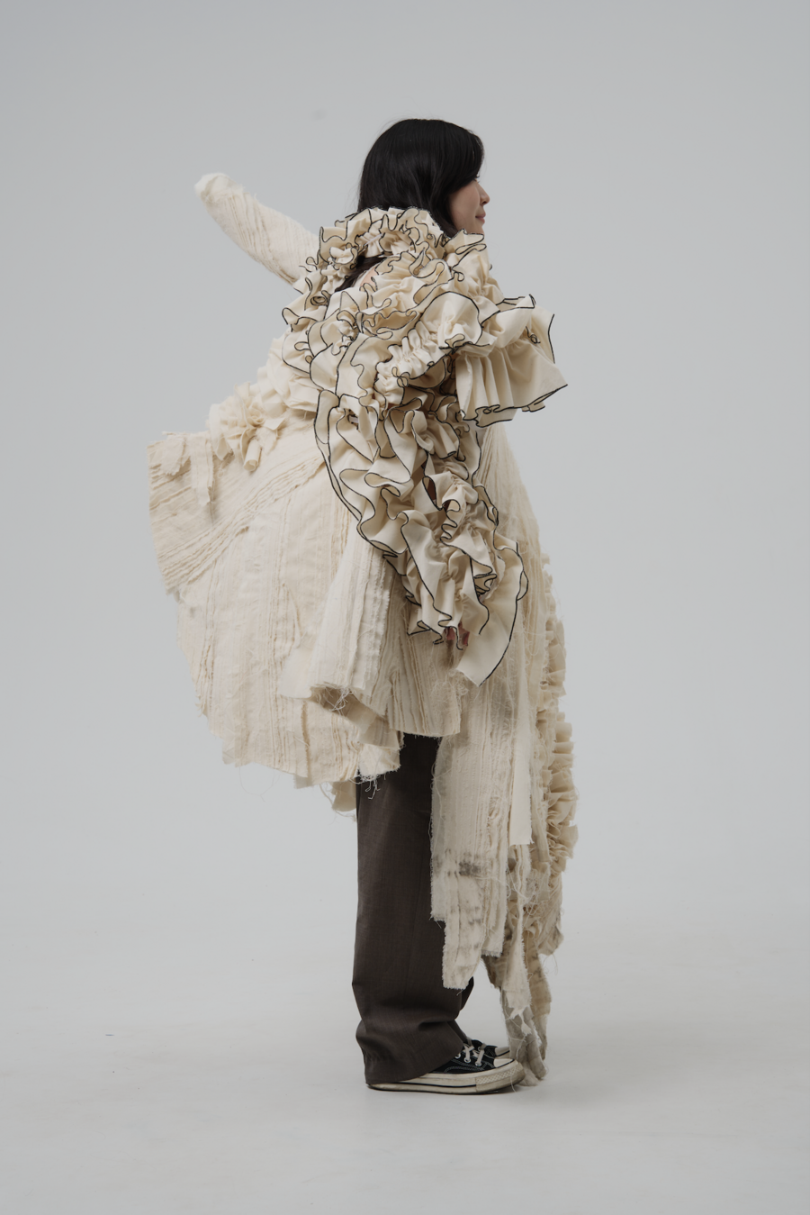 This is how the idea of comparing life and death, which always go hand in hand, appeared. Yohji always worked hard, invented, created, believed in his work, until somewhere inside everything was destroyed a long time ago due to a great personal tragedy. In this project, I touch on the topic of contrasts. The eternal dualism of the world inspired me to explore the interweaving of lives. This is due to the aesthetics of Yamamoto, which based its brand on personal experiences and memories brought about by traumatic experiences during World War II.