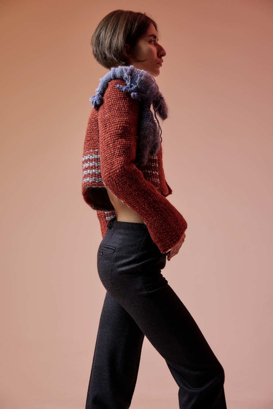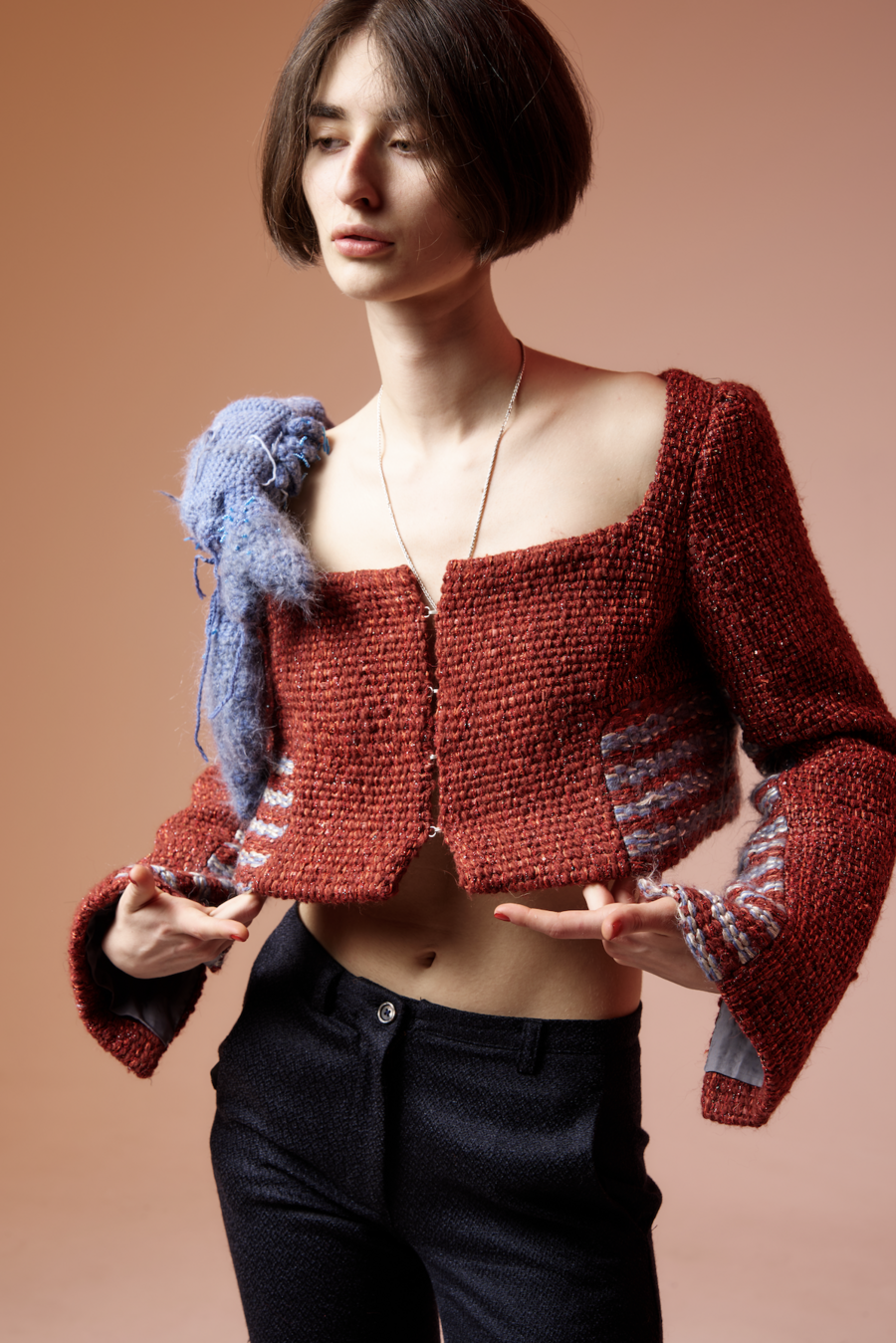 According to the results of the research, the shape, color palette and various details of the product were developed. The work began with the search for suitable threads, from which I later began to create fabric on looms, after which the fabric is steamed, the next step is to stitch each piece with organza by hand to add density. Then the product is assembled and finally the lining, which is also quilted by hand, and the final touch is a crocheted lobster. This project does not use a sewing machine.