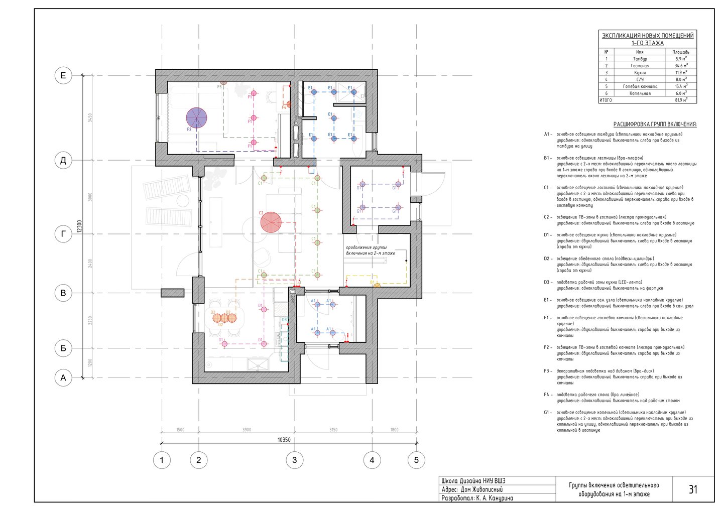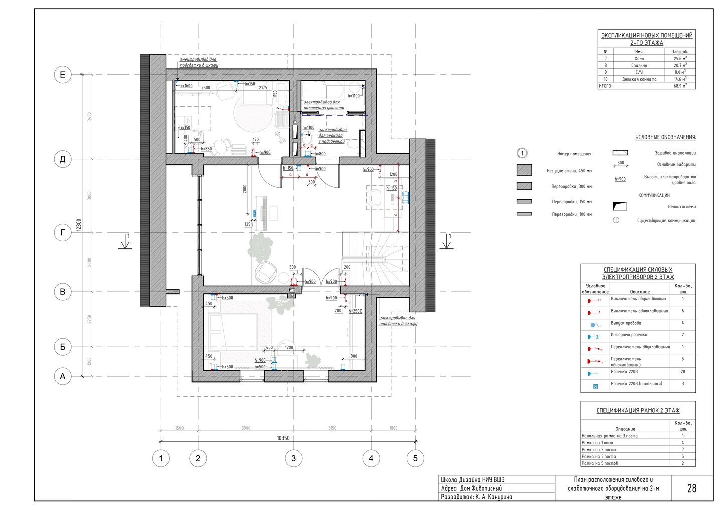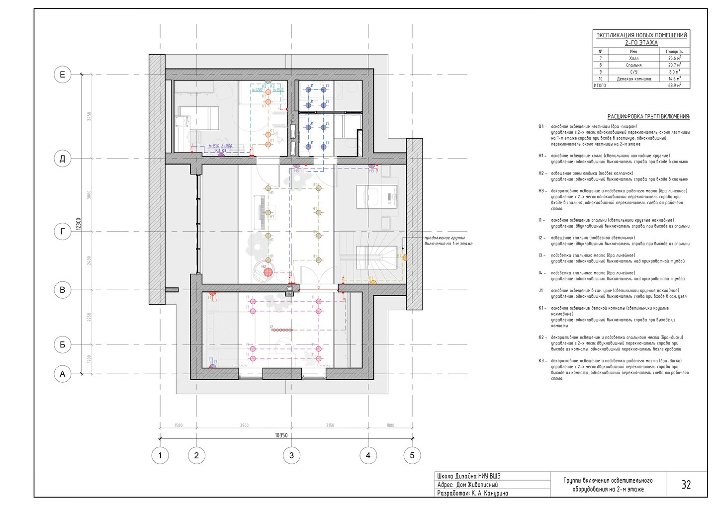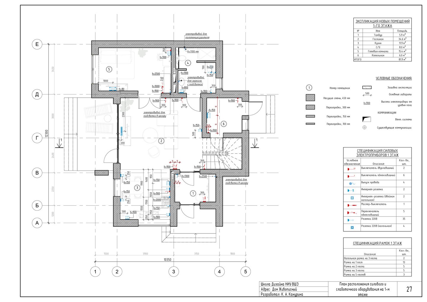 Альбом чертежей выполнен в программе Revit. Включает чертежи фасадов, разрез, аксонометрические виды, планы отделок полов, стен, потолка, планировочные решения, планы электрики, сантехники, развертки и перспективные виды.