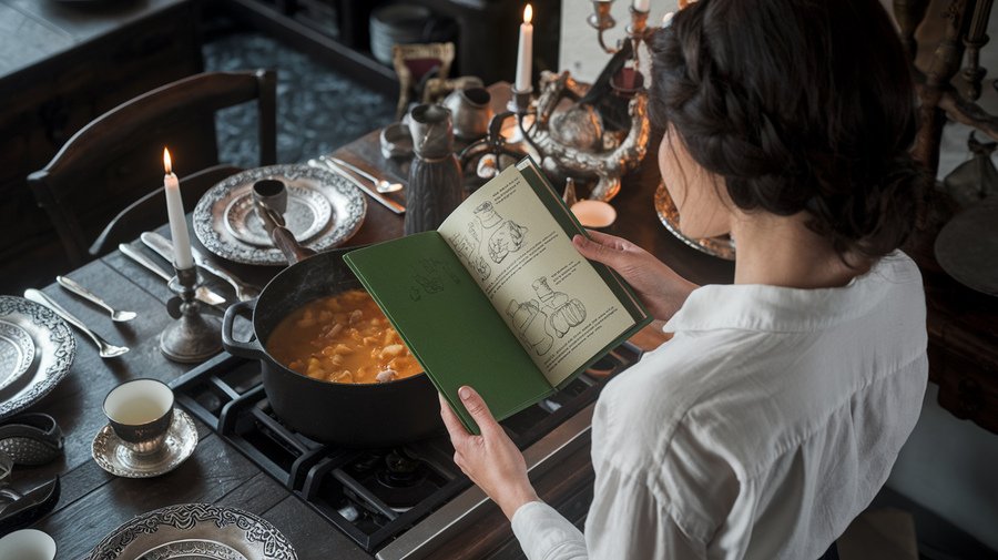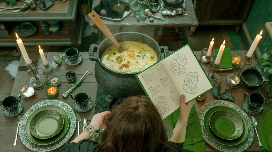 Prompt: a realistic photo showing a woman with dark hair. We look at her from above, see the back of her head. She is cooking soup in a black pot resembling a cauldron. With her other hand, she holds a green cookbook in which pencil sketches of recipes are visible. The kitchen is decorated in dark tones. The furniture is wooden, there are silver cups, beautiful plates and candles on the kitchen table. The atmosphere in the picture is magical, reminiscent of witches and the Middle Ages. The picture uses a green colour scheme.