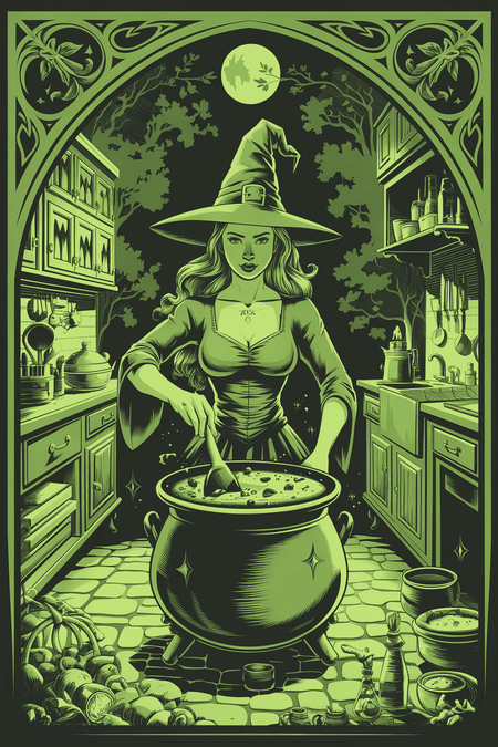 - A poster for the WITCHEN kitchen and home goods brand with a Gothic style and witch aesthetics. The background is a dark night sky with a full moon. There is a silhouette of a witch with a green dress, a pointy hat, and a broomstick. She is flying above a house with a thatched roof. The house has smoke coming out of the chimney. There are various kitchen and home goods around the witch, such as a cauldron, a wooden spoon, and a broom. The text «WITCHEN: Cooking is a Process Full of Magic» is written in a Gothic font. The green text stands out against the dark background.