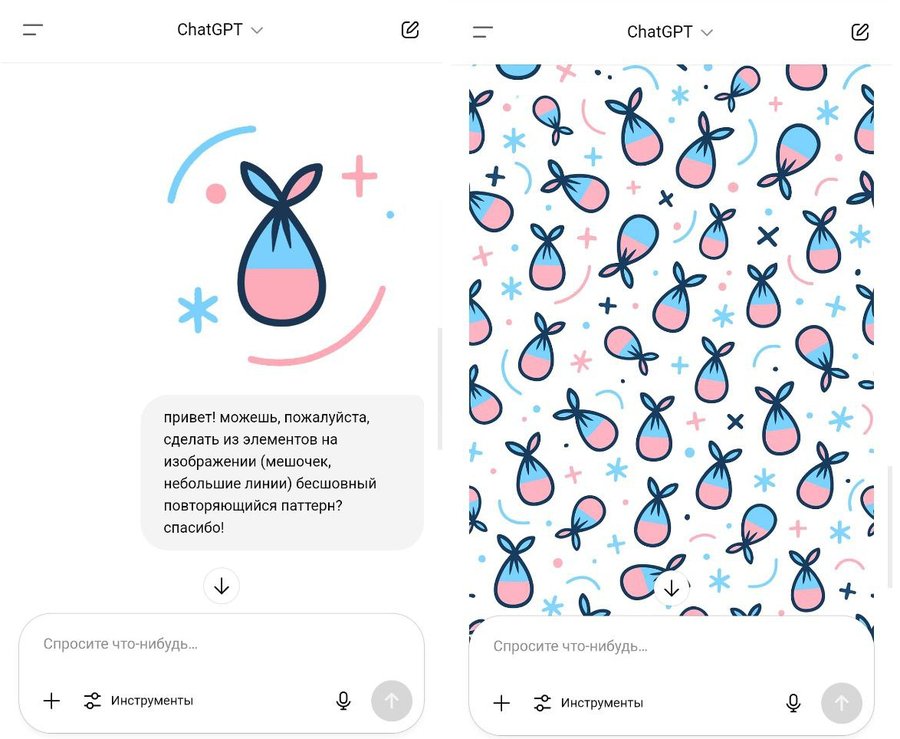 Так, я использовала Chat GPT для создания фирменного паттерна, создания логотипа и изменения художественного стиля изображения: