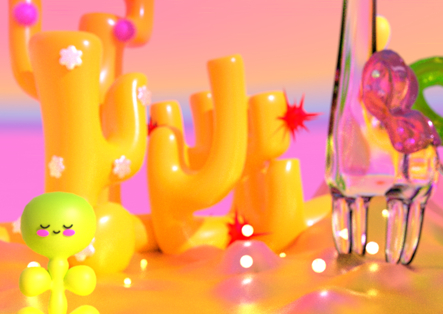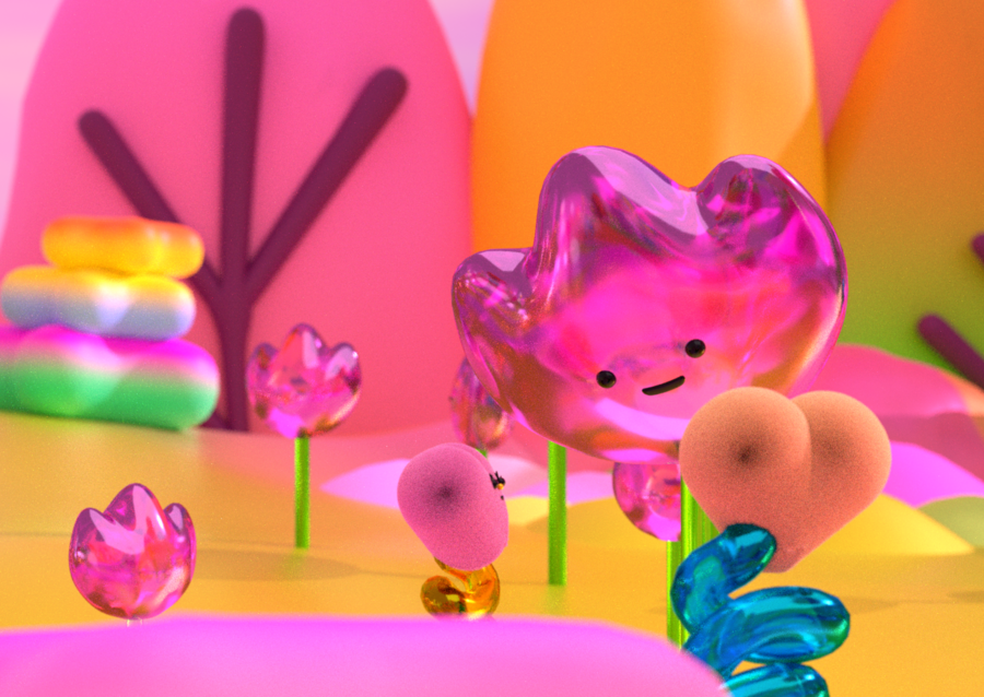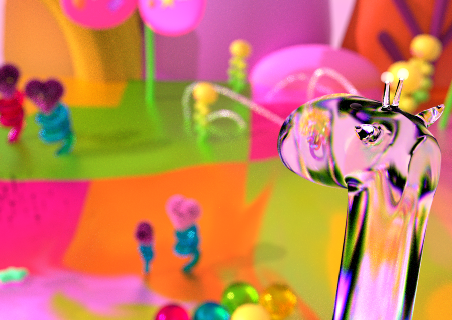 Промпт: virtual park space with imaginary animals. magical atmosphere and bright colors. fluffy plants, transparent sprouts from the ground, open pink sky. 3d render.