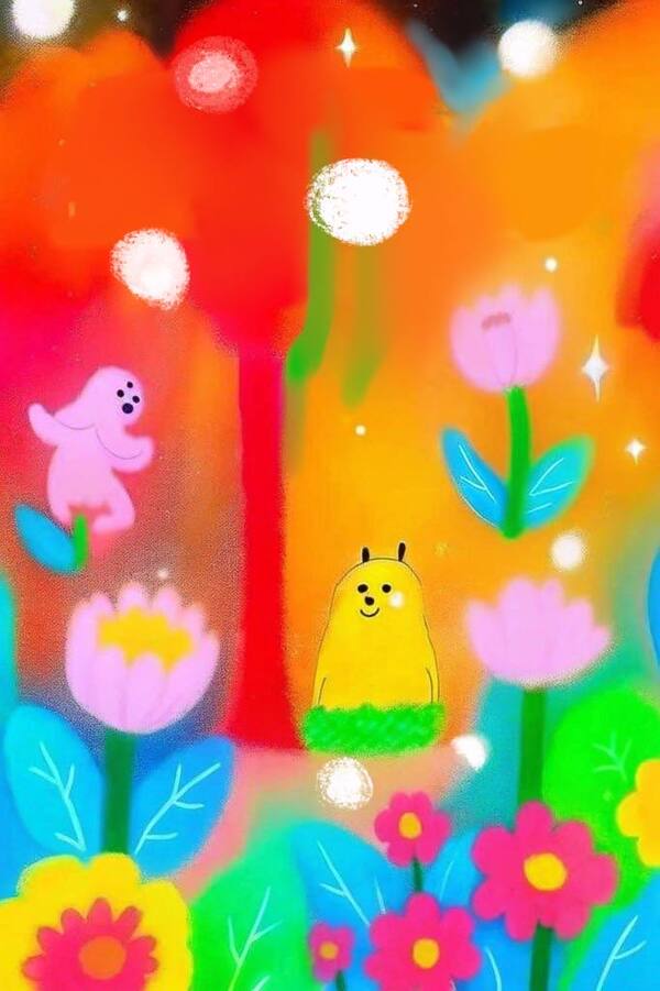 Промпт: Blip-blop virtual space poster with magical flowers. naive atmosphere and bright colors. children’s drawing of imaginary animals.