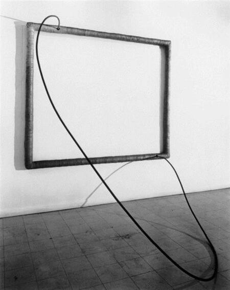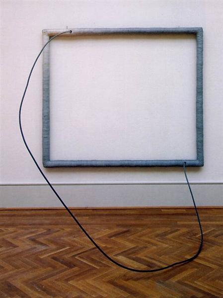 Работы Евы Гессе часто находятся на грани живописи и скульптуры, используя промышленные и «неблагородные» материалы (латекс, стекловолокно). «Hang Up» — это буквально пустая рама с выходящим из нее длинным металлическим тросом, что иронизирует над идеей живописной плоскостности и автономии.