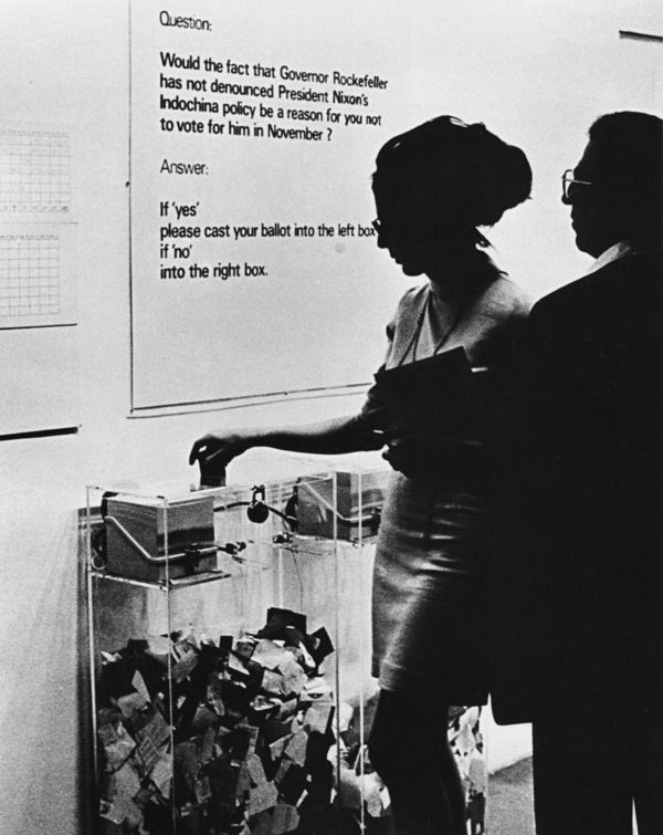Ханс Хааке в своих работах вскрывал экономические и политические подоплеки функционирования арт-институций или городских структур. В этом случае искусство не просто существует в институции, но и критикует ее. Происходит разоблачение скрытых властных отношений, что противоречит идее нейтральности и автономии искусства.