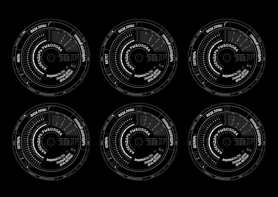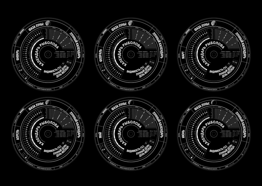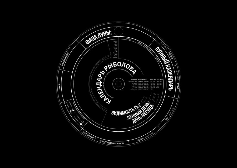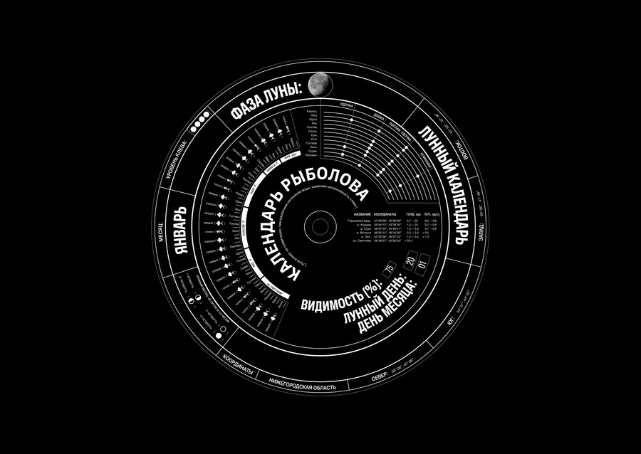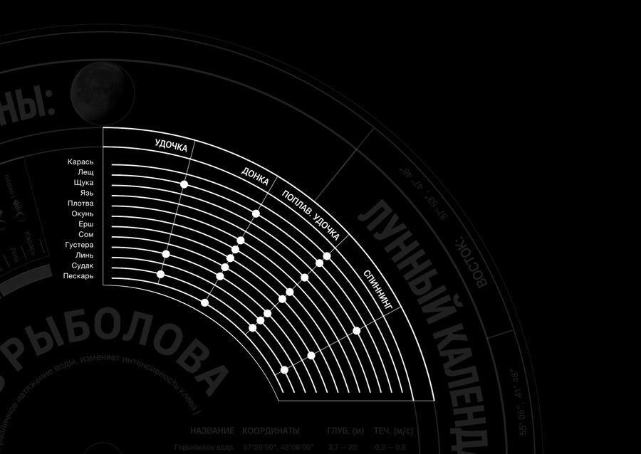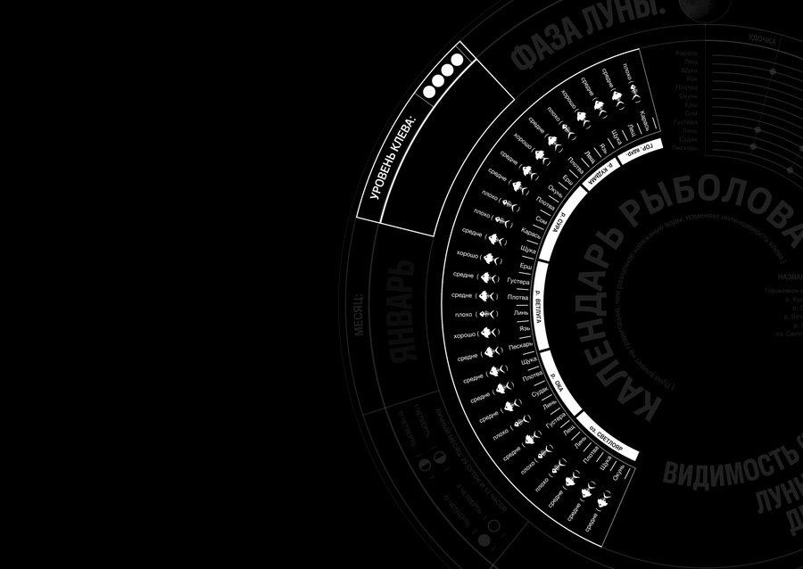 В календаре рыболова скомбинированы лунные фазы, уровень клева, благоприятность ловли тех или иных видов рыб и атрибуты, которые стоит использовать на рыбалке.