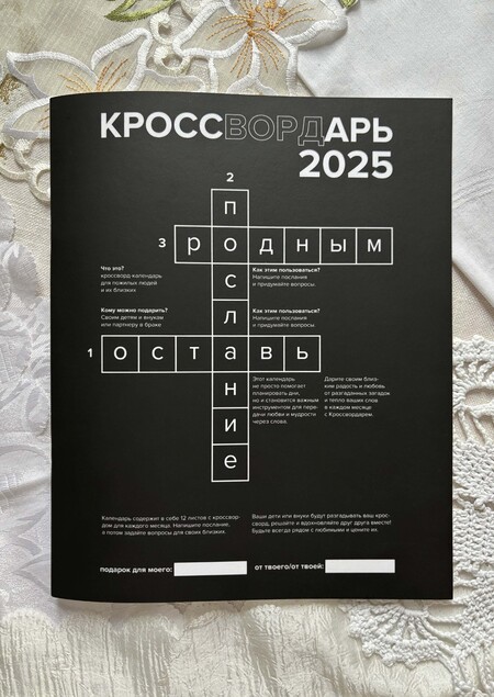 Календарь совмещенный с кроссвордом, позволяющий пожилым людям самим составлять кроссворды и оставлять послания своим родным и близким, которые те должны решить и найти ответ. Календарь служит вечной связью между молодым и более старшим поколением.