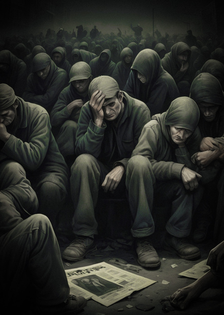 Prompt: Create a thematic poster showing the suffering of people due to high unemployment, use dark colors, mostly black