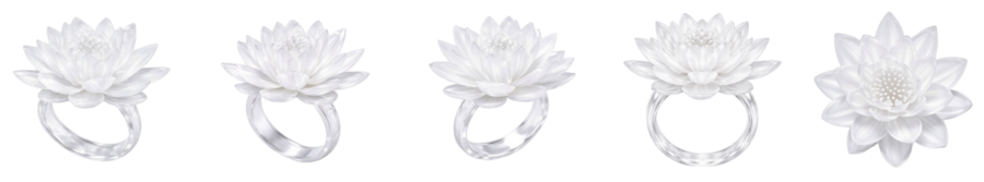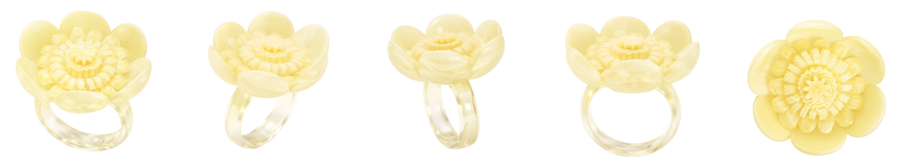 Формообразование Формы колец строятся на принципах органики и асимметрии. В них отсутствует жесткая геометрия, вместо этого используются плавные линии, мягкие изгибы и текучие объёмы. Форма не стремится к буквальной имитации цветка, а представляет собой абстрактную интерпретацию природных мотивов.
