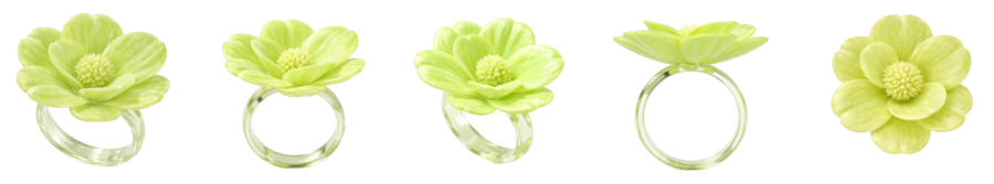 4. A translucent light green crystal flower ring, inspired by water lilies, sculpted from frosted glass with soft milky translucency, rounded layered petals with subtle organic texture, detailed floral center, smooth clear glass ring band with a green tint, minimal luxury jewelry design, high-end studio product photography, isolated on pure white background, soft diffused lighting, gentle shadows and reflections, ultra-realistic, macro detail, airy and fresh aesthetic, 8k