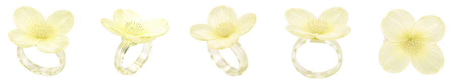 5. A translucent pale yellow crystal flower ring with four rounded petals, sculpted from frosted glass with soft silky translucency, delicate central stamens, smooth clear glass ring band with a warm yellow tint, minimal luxury jewelry design inspired by water flowers, high-end studio product photography, isolated on pure white background, soft diffused lighting, gentle shadows and subtle reflections, ultra-realistic, macro detail, airy and elegant, 8k