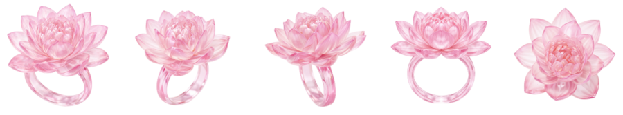 Промпты: 1. A translucent pink glass lotus flower ring, hyper-detailed, delicate layered petals made of crystal glass, soft pastel pink tones, elegant jewelry design inspired by water flowers, smooth glass ring band, studio product shot, isolated on pure white background, high realism, macro, soft diffused lighting, subtle reflections, luxury jewelry aesthetic, ultra clean, 8k
