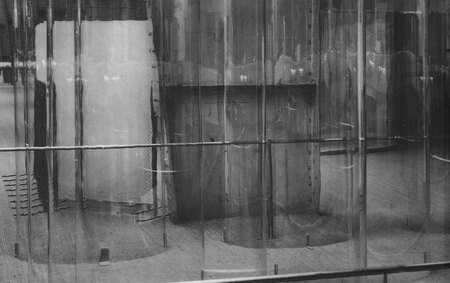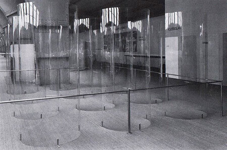 Прием с ширмами, использовавшийся ранее с тканями, здесь приобретает большую строгость за счет материала — стекла. Его хрупкость и различные фактуры задают изменчивое положение проникающего света относительно зрителя за счет чего возникает глубина. Четкие же конструкции, на которых закреплено стекло дают ощущение надежности и самих стекол.