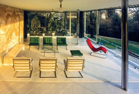 слева: Поисковый эскиз кресла в соавторстве с Людвигом Мис ван дер Роэ, 1926 г. справа: интерьер виллы Тугендхат с меблировкой Лилли Райх, 1928–1930 гг.