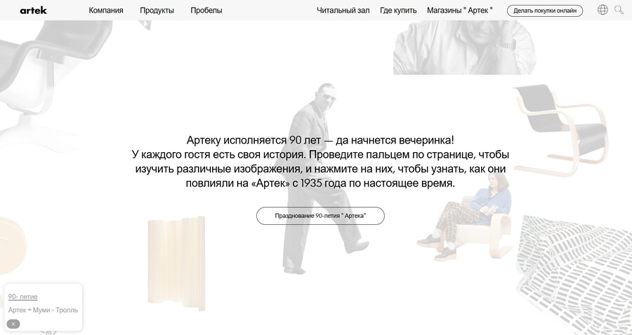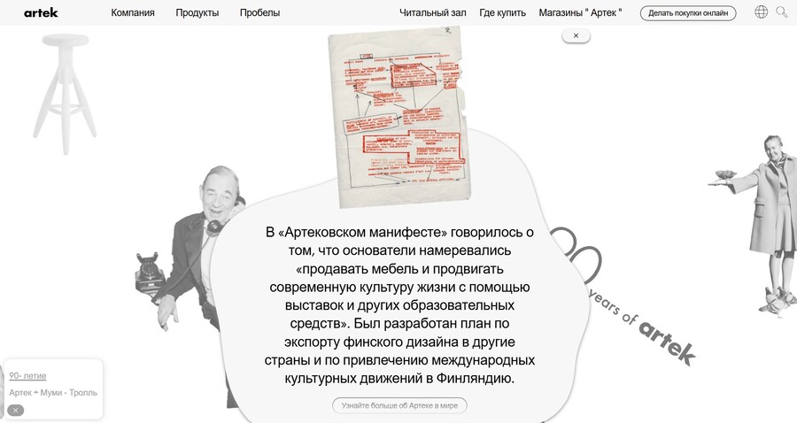 Стиль оформления этой страницы похож на стикер-пак, который можно использовать в социальной сети в качестве эмоджи. Набор может стать сувениром в виде брендовых наклеек для фанатов. Каждая «вырезка» этого коллажа — это визуальный «мем», ведущий ссылкой (прямой — на сайте, ассоциативной — в голове вовлечённых) на какую-то конкретную историю artek. Такая визуальная эстетика в сочетании с детской лёгкостью в цифровом оформлении не только не противоречит общему настроению бренда, а проецирует его философию простоты и современности актуальным настоящему времени языком. Фон меняется — может быть зелёным или белым. При наведении на каждый стикер появляется заголовок темы, а при нажатии — «облачко» с краткой историей в одно предложение, кликнув на которое можно прочесть историю полностью. Поле можно двигать во все стороны, создавая ощущение пространства и бесконечности историй.