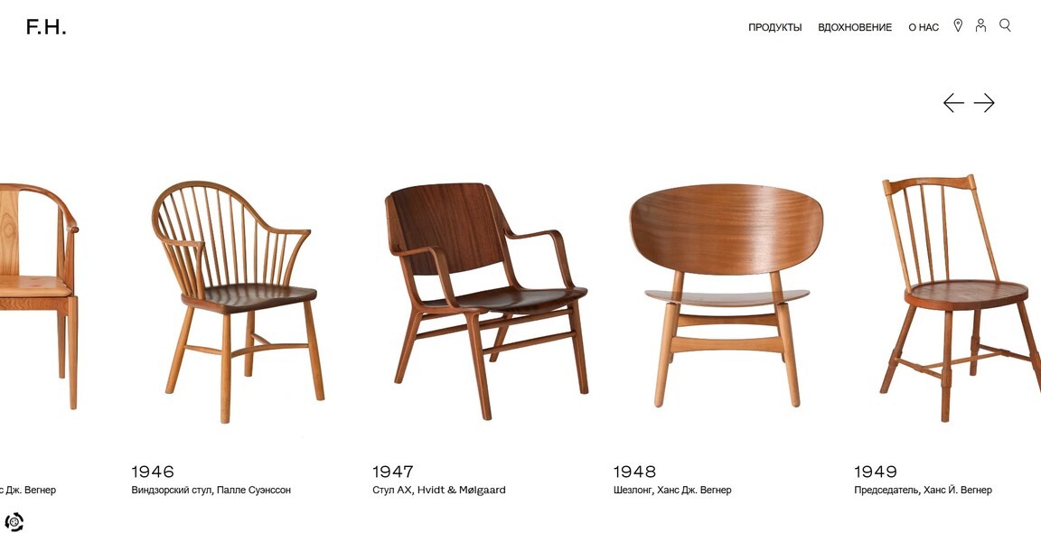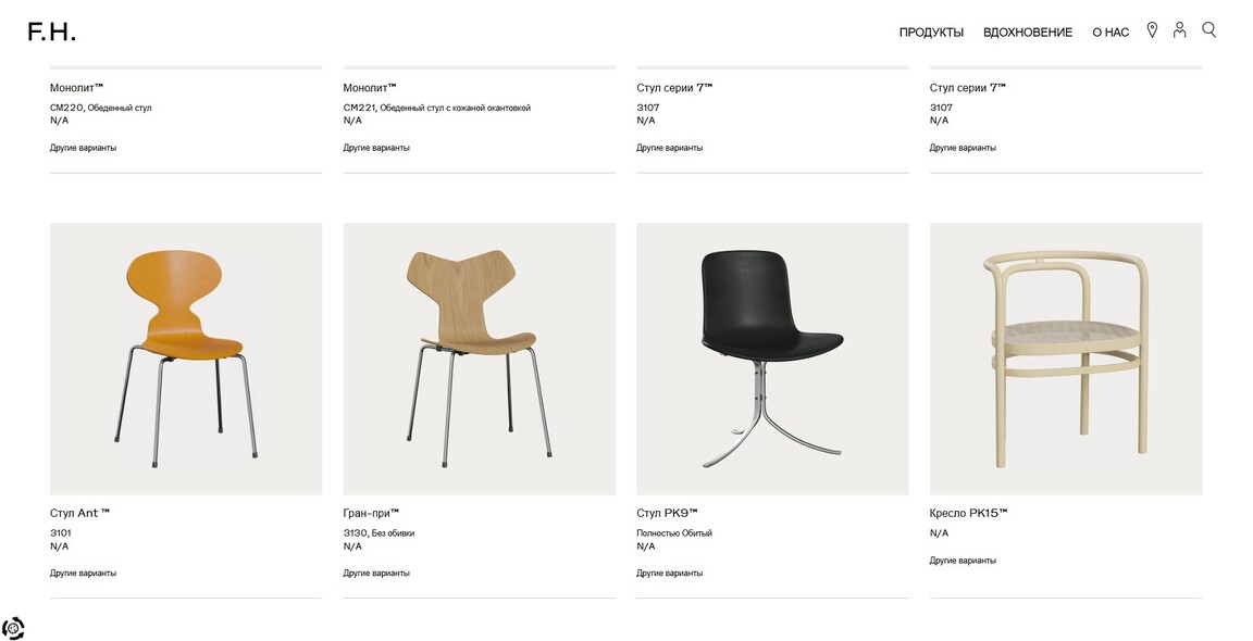 Сопоставить с Артеком можно компанию Carl Hansen & Søn — датская мебельная компания, так же как и artek ставшая символом скандинавского модернизма. Основанная в 1908 году как небольшая мастерская, сегодня она производит известные модели мебели, такие как Wishbone Chair Ханса Вегнера и другие культовые предметы. При оформлении сайта акцент сделан на историчность (чёрно-белые снимки, известность персоны дизайнера), а каталог предметов сделан «как везде». Тот же подход у ещё одной датской компании — Fritz Hansen, существующей с 1872 года. Сотрудничество с Арне Якобсеном (Ant Chair 1952, Egg Chair 1958, Swan Chair 1958), Поулем Кьерхольмом (PK-серия) сохраняют её известность, не подвергая рискованным трансформациям. Классическое оформление сайта подчёркивает незыблемую значимость дизайна, проверенного поколениями. Зернистость чёрно-белых снимков ещё раз говорит о долгой и состоятельной истории компании.