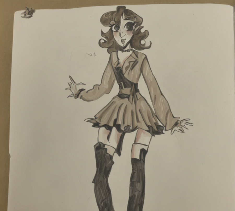 Модели удалось обнаружить особенности отрисовки: лайн с толстым многослойным, чаще всего карандашным штрихом; штриховка и плотное закрашивание теней; «волнистость», свободность линии; покрас пастельного типа, со слоями цвета, накладывающимися друг на друга.