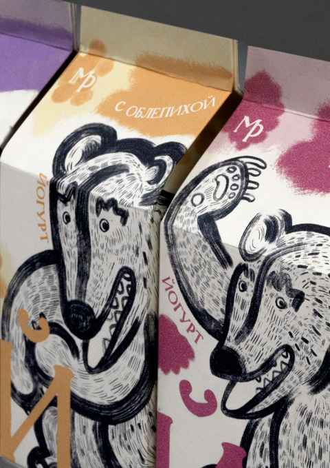 Для проекта упаковки молочной продукции была выбраны иллюстрации Татьяны Мавриной в качестве метафоры. Графическим решением здесь послужило выделение вкуса продукта цветом, а жирность показана градацией от светлого к темному. А также целью проект было оставить активную графику линий и их характер из оригинальных иллюстраций Татьяны Мавриной.