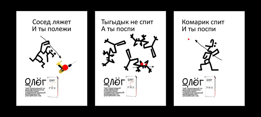 Бренд седативного чая с необычной подаче. Акцент сделан на противопоставлении: успокаивающий чай рекламируется в маньячной манере. Общий антураж совмещает в себе минималистичную подачу и жутковатость. Я поставила себе задачу сохранить акцент на красной точке и придерживаться чёрно — белой палитры, как в проекте — референсе.