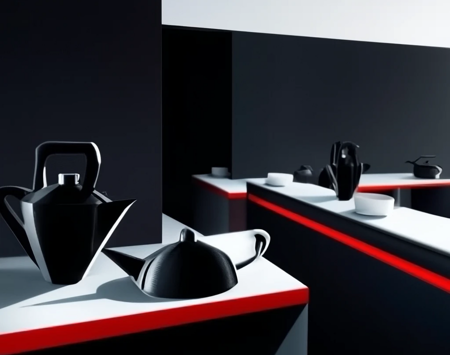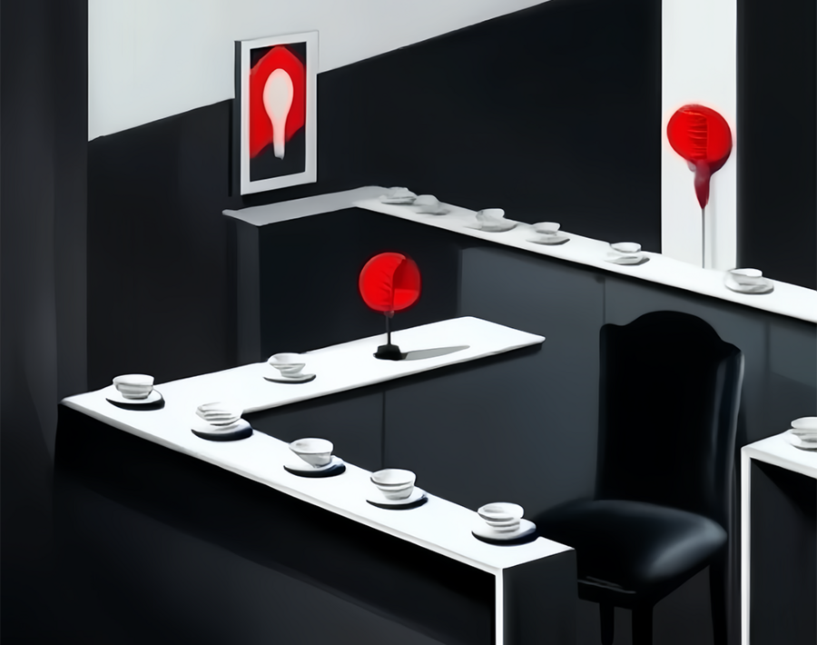 Следующей задачей было создать концепт локации, где могут проходить чаепития. Упор был не на реалистичность изображений, а на эффектность и передачу настроения. В начале мне нужны били изображения интерьера, а после было решено добавить официантов в кадр. Модель: Craiyon (базовая) Промт: We designed a tea room interior for the Calm Madness tea brand. The style is manic, minimalist, modernist, black and white, with subtle red accents. The image should feature teapots and cups, waiters walking by, and be realistic.