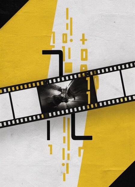 «Создай минималистичную обложку с кинопленкой, цветовая гамма жёлтая, белая и черная, добавь элементы и иконки программирования например цифры 1 и 0»