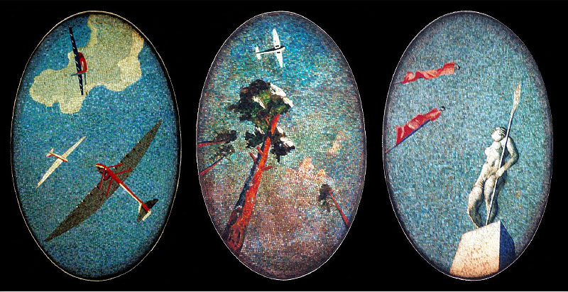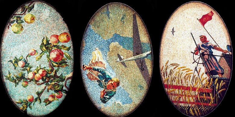 Темы мозаик: «Садоводы», «Сталевары», «Машиностроители», «Строители»«Авиаторы», «Лыжники» (мост Бачелиса), «Шахтёры» (демонтирована при установке гермозатвора в конце 1950)