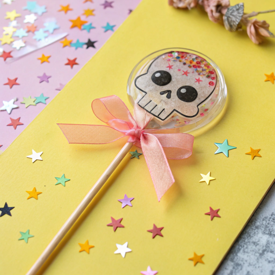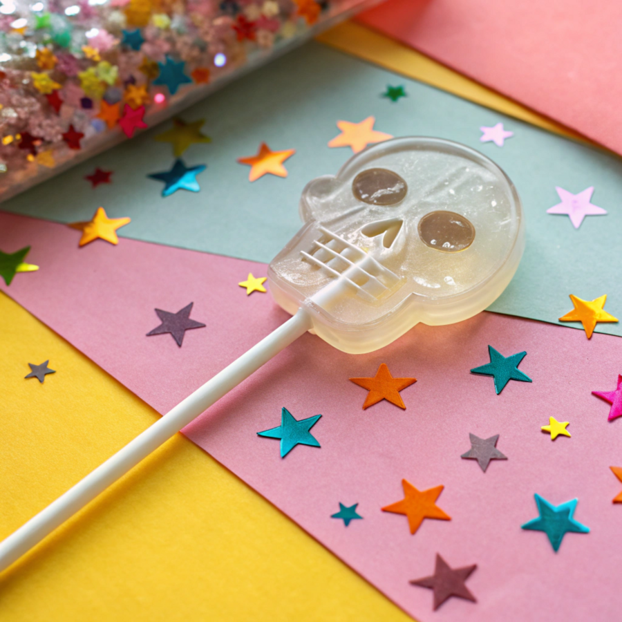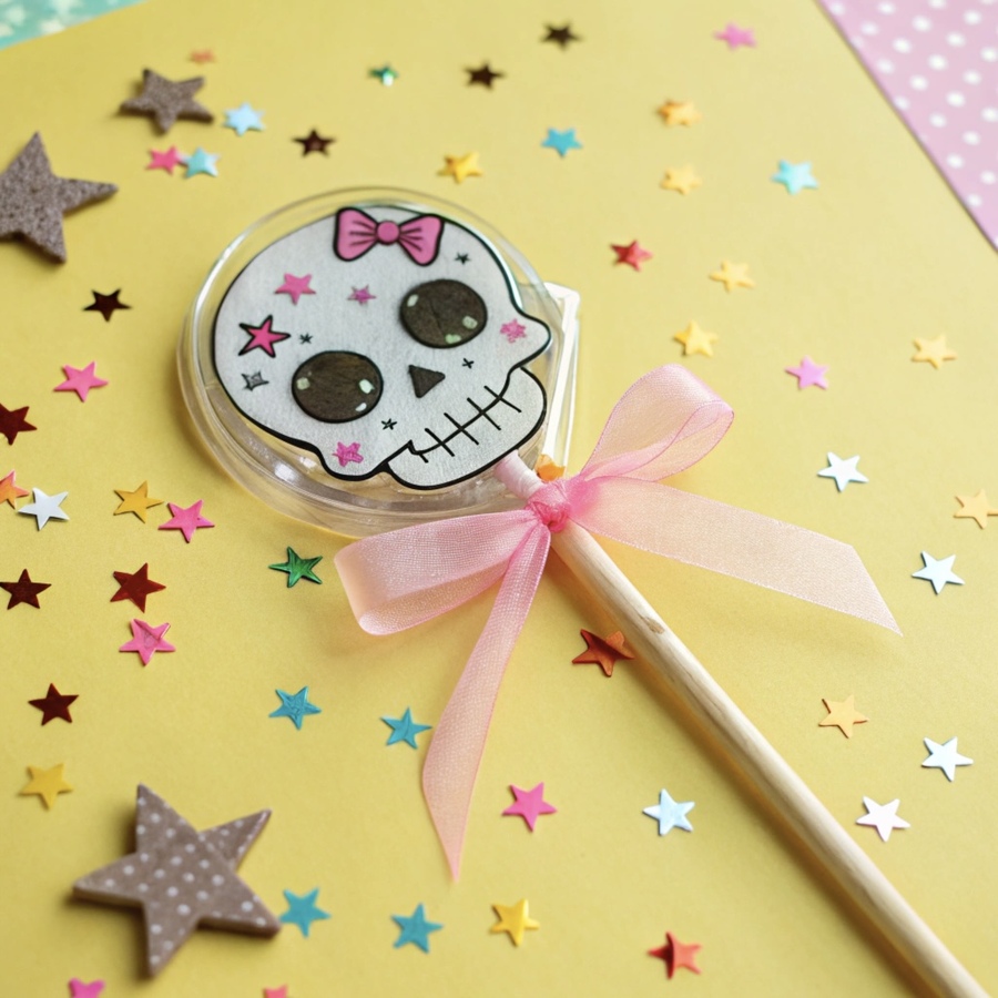 Промт 2 (1 и 3 картинки): a transparent lollipop with a skull with a wooden stick lying on a table, a bow tied around the stick, colored background, daylight, colored stars cut out of paper lying around. Промт 3 (2 картинка): a transparent lollipop with a skull lying on a table, colored background, daylight, colored stars cut out of paper lying around.