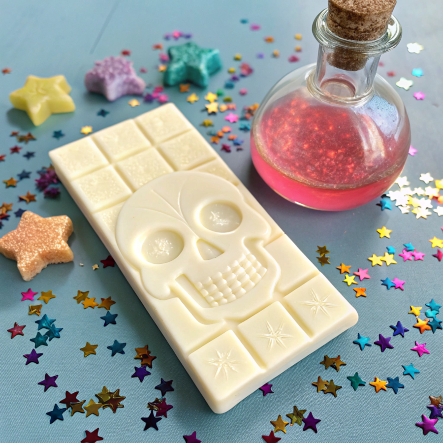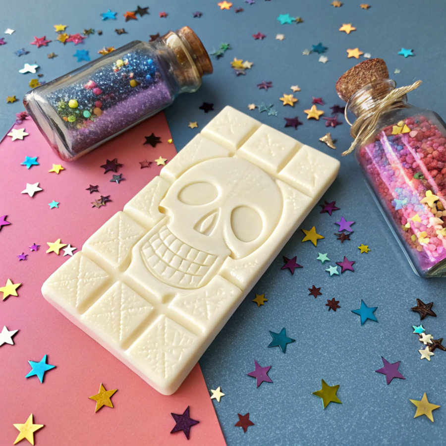 Промт 1: A bar of white chocolate with a skull on it lies on the table, a colored background, small stars cut out of paper lie nearby, cute flasks with a colored potion are located next to the chocolate bar, daylight.