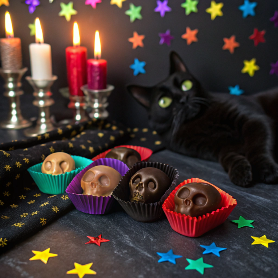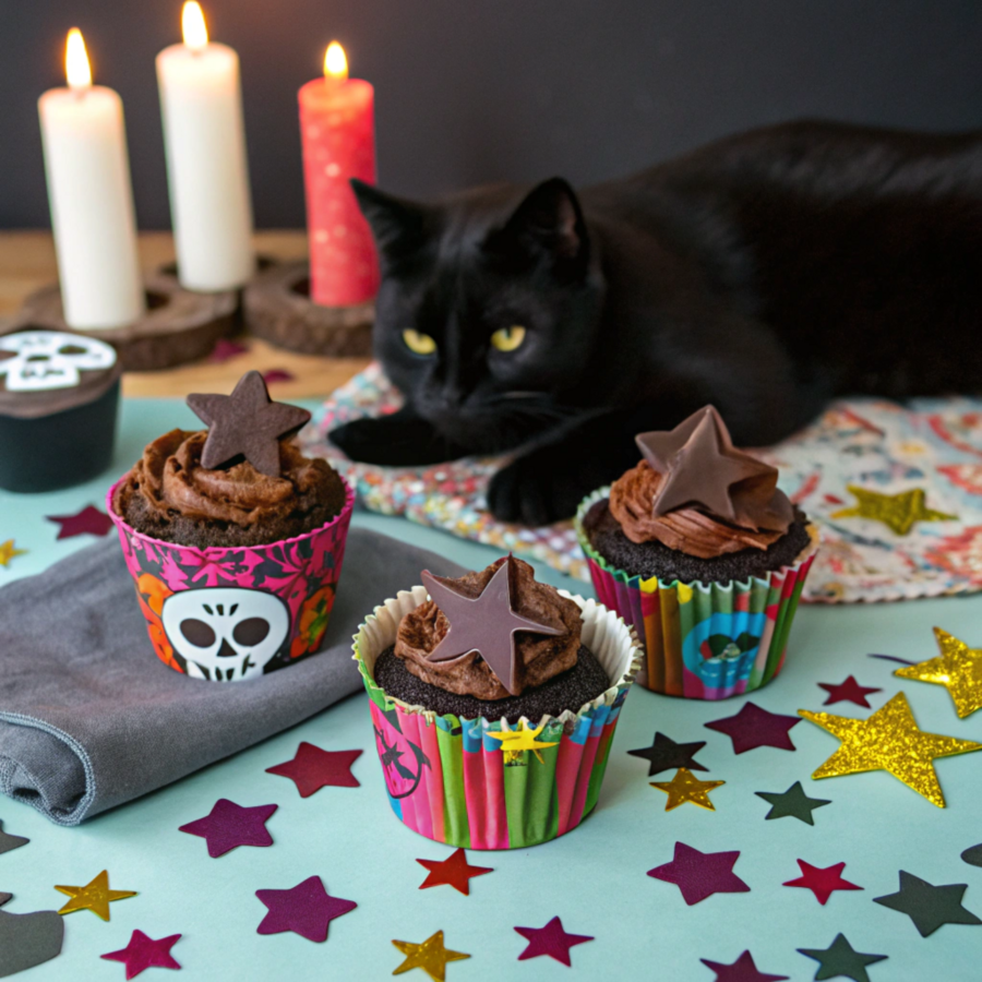 Промт 4: Dark tones, in the center of the image are chocolate cupcakes in the shape of skulls, around are burning candles, colored paper stars, a black cat lies next to it, mystical, magical atmosphere.