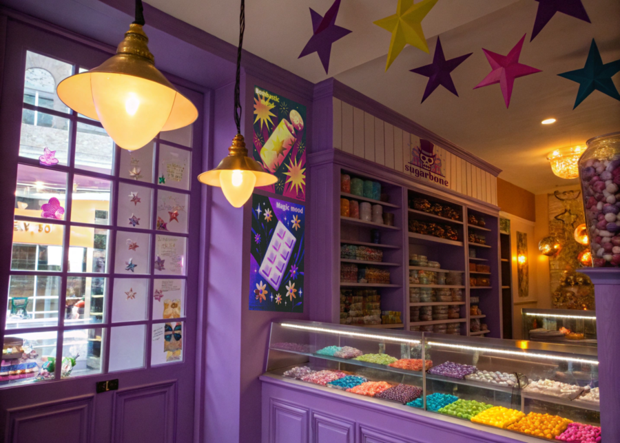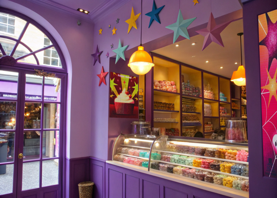 Промт: interior, candy store, purple tones, warm yellow lighting from above, you can see the window with sweets, all decorated with colored decorations in the form of stars.