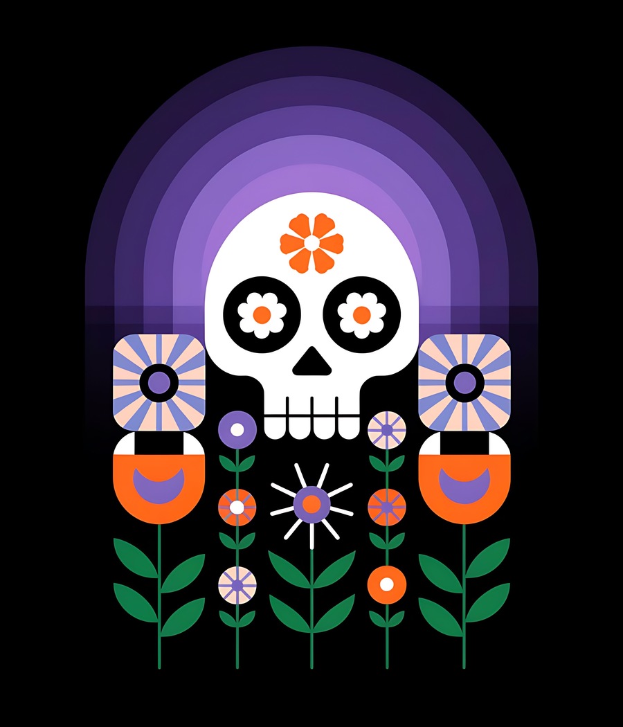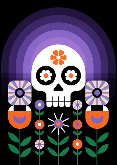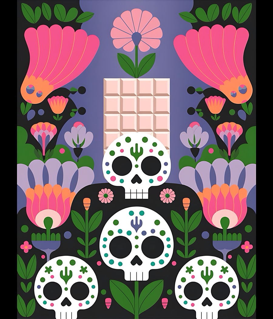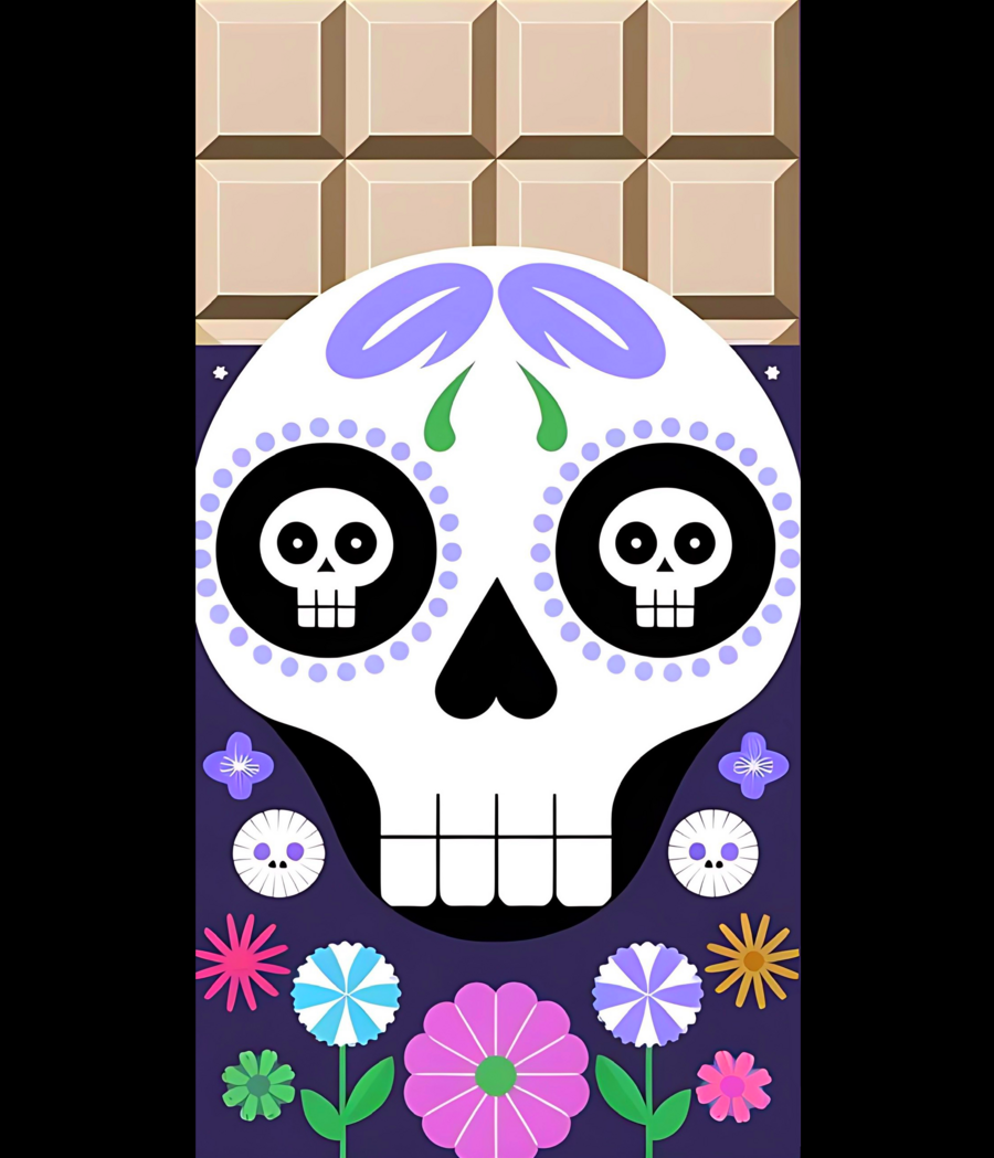 Промт: design for packaging for white chocolate, minimalism, laconic forms, a lot of cute details in the form of colorful flowers, in the center is drawn white chocolate bar with skulls on it, purple background with gradients.