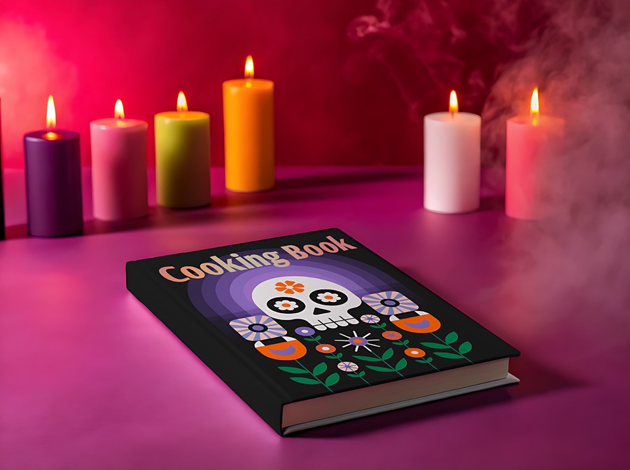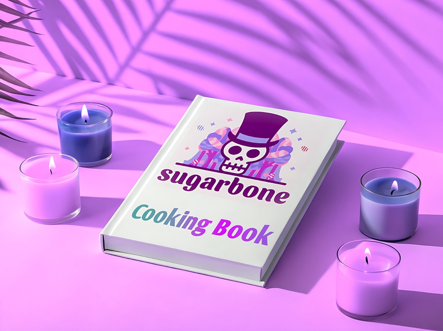 В качестве носителей я решила сгенерировать кулинарные книги и кружки, так как на них в выгодном свете демонстрируется узор и, собственно, стиль бренда SugarBone. Сначала я сгенерировала мокапы в Recraft Ai, а затем в Procreate добавила изображения на мокапы и текст (также на второй картинке с книгой я немного поменяла тон и насыщенность).