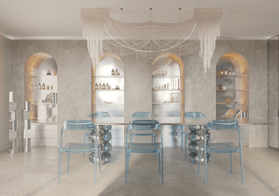 Центральный бетонный стол становится символом этого единства — устойчивым, но пластичным, соединяющим в себе архитектуру и ремесло, современность и уют.