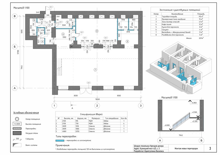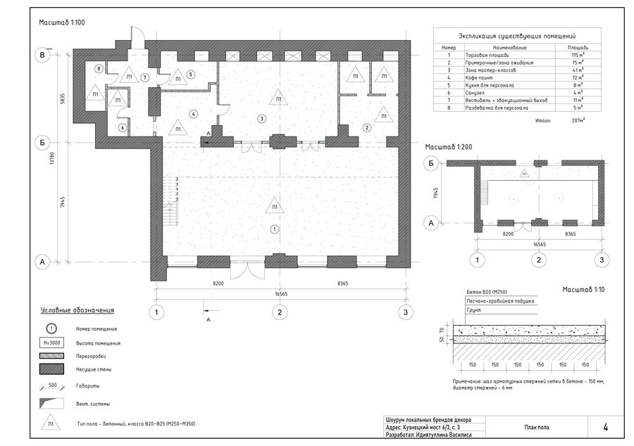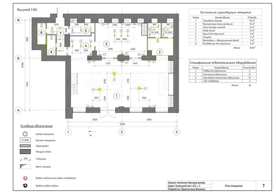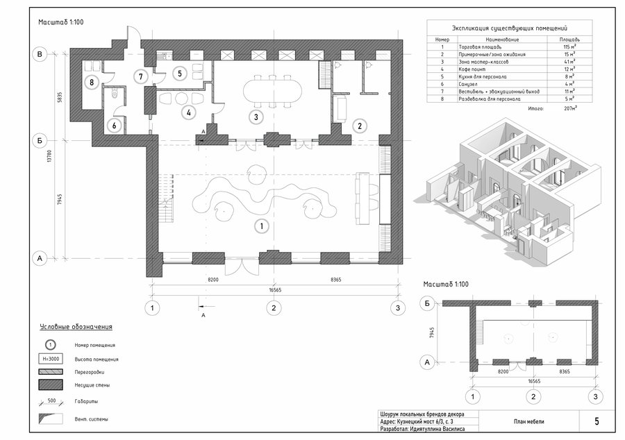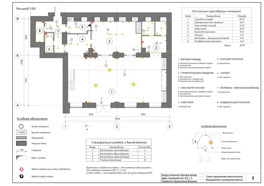 1 — торговая площадь 2 — примерочные 3 — зона мастер классов 4 — кофепоинт/зона отдыха 5 — столовая для персонала 6 — санузел 7 — вестибюль 8 — раздевалка для персонала