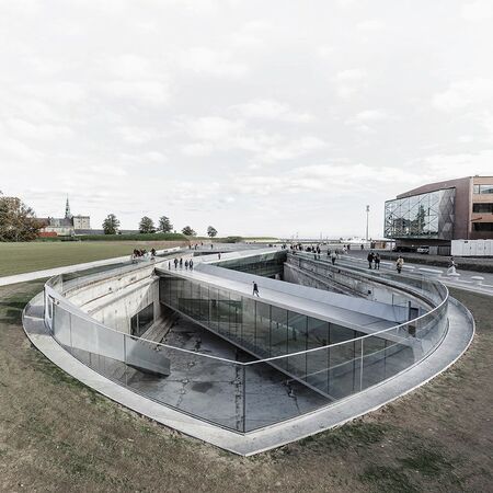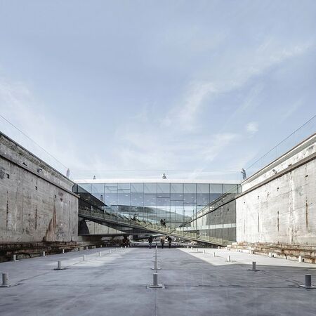 Музей расположен в бывшем сухом доке, где когда-то строили и ремонтировали корабли. Архитекторы сознательно отказались от привычного надземного объёма: все выставочные пространства размещены ниже уровня земли, вокруг пустого бетонного бассейна. Таким образом, само отсутствие корабля становится главным экспонатом. Архитектура работает не с предметами, а с пространством, позволяя пережить память как физический опыт, а не как рассказ.