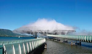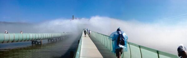 Сооружение, фактически лишённое формы: стальная платформа с системой форсунок, распыляющих воду, создаёт облако искусственного тумана, внутри которого исчезает само здание. Посетители поднимаются на мост и входят в пространство, где ориентиры теряются, а восприятие строится не на зрении, а на ощущении — влажности воздуха, плотности света, звуке воды. Здесь архитектура становится процессом, а не объектом: она существует только пока работает система распыления.