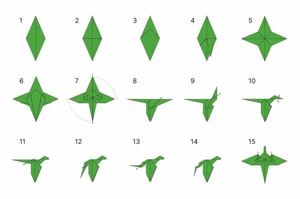 1. Исходный квадрат складывай в базовую форму «Птица»: квадрат складываем по двум диагоналям и двум вертикалям, выворачивай ромбы. 2. Опускай верхнюю половину. 3. Правую сторону складывай влево. 4. Нижнюю часть раскрывай в стороны. 5. У нас должна образоваться четырёхконечная звезда. 6. Переворачивай заготовку. 7. Сгибай оба нижних края к центральной оси. «Карманы», которые при этом выделяются, сплющивай. 8. Поворачивай фигуру на 90° по часовой стрелке. 9. Складывай её пополам «долиной». Делай сгибы вперёд и назад по пунктиру. 10. Наклоняй голову дракона-оригами. 11. Прячь внутрь острый уголок головы. 12. С противоположной стороны начинай складывать хвост. 13. Делай второй изгиб, меняя направление. 14. Делай третий изгиб, меняя направление. 15. Твой дракон готов (вид снизу).