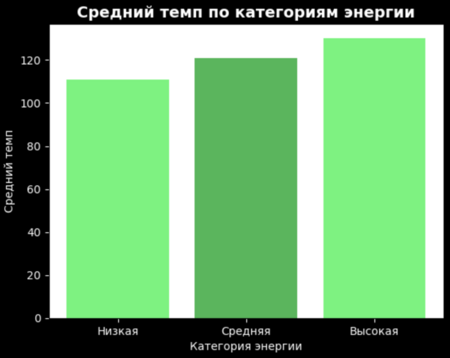 3.После этого была создана столбчатая диаграмма для анализа энергичности и темпа треков, а также средней громкости композиций
