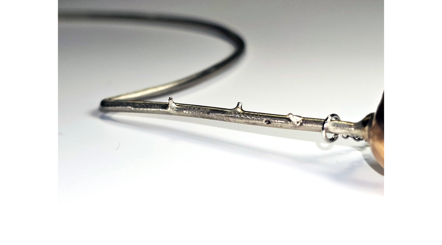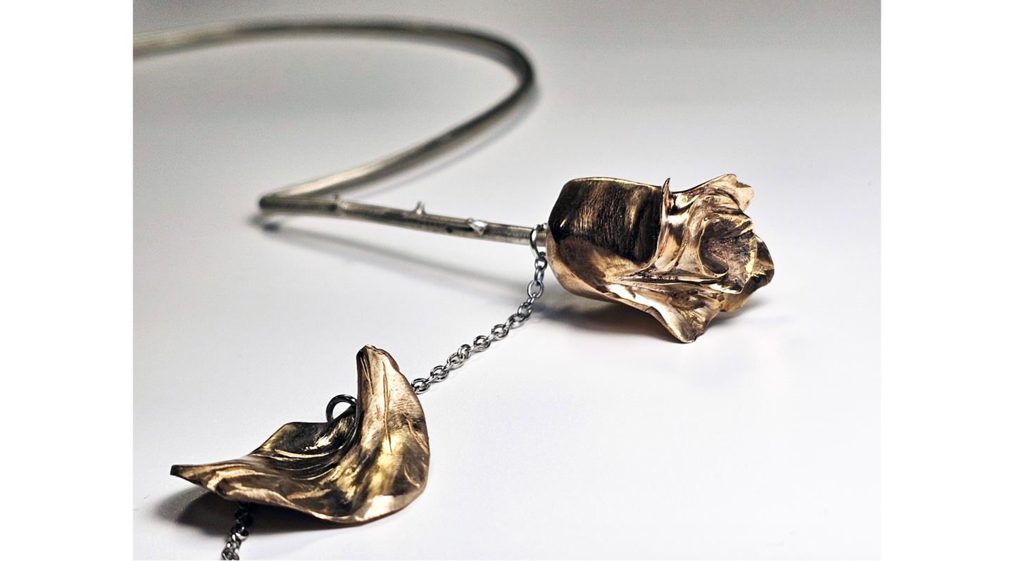 Полуожерелье «В её сердце — вера» обращается к гаданию на лепестках розы, где судьба чувств определяется тем, сколько лепестков останется на стебле. В дизайне полуожерелья переплетаются два образа: распускающиеся лепестки розы и стилизованная форма сердца. Подвижные звенья ожерелья создают эффект естественного движения, напоминая о медленном опадании лепестков во время гадания. «Опадающие» лепестки опстепенно превращаются в подвеску-сердце. Это символическое решение соединяет логику гадания с языком чувств: сколько бы лепестков ни упало, сердце продолжает верить в любовь.