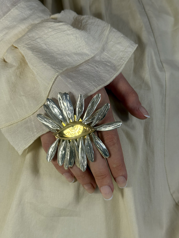 Двойное кольцо «В её глазах — ответ» посвящено гаданию на лепестках ромашки. В дизайне объединены образы глаза и цветка: глаз образует сердцевину ромашки, а зрачок становится центральным элементом, зеркалом души, которая задает вопрос: «любит — не любит?»
