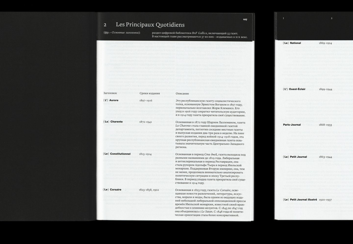 Во второй главе раздела «Исторический контекст» приведены описания основных французских газет интернет-библиотеки Gallica. Из 55 заголовков были отобраны 37, издававшиеся в XIX веке