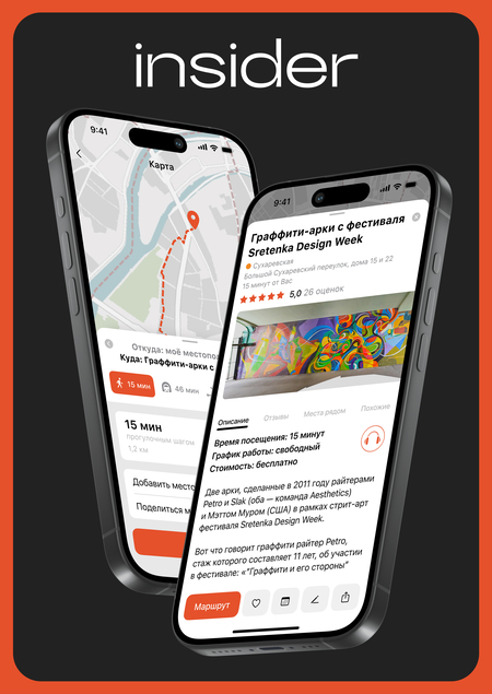 Insider — приложение для уникальных прогулок по городу, помогающее открывать новые для себя места, которые соответствуют сферам интересов пользователя, и предоставляющие подробную информацию о местах