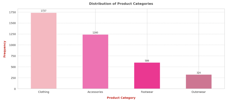 На диаграмме видно, что категория «Clothing» (одежда) является самой распространенной с 1737 товарами, что указывает на высокий спрос или широкий ассортимент. «Accessories» (аксессуары) занимают второе место по распространенности с 1240 позициями, также указывая на их популярность. «Footwear» (обувь) имеет 599 товаров, что свидетельствует о более узкой нише или меньшем разнообразии. Наконец, «Outerwear» (верхняя одежда) представлена наименее (324 позиции), что может быть связано со спецификой ассортимента или сезонными колебаниями спроса. В целом, основное внимание уделяется одежде и аксессуарам.