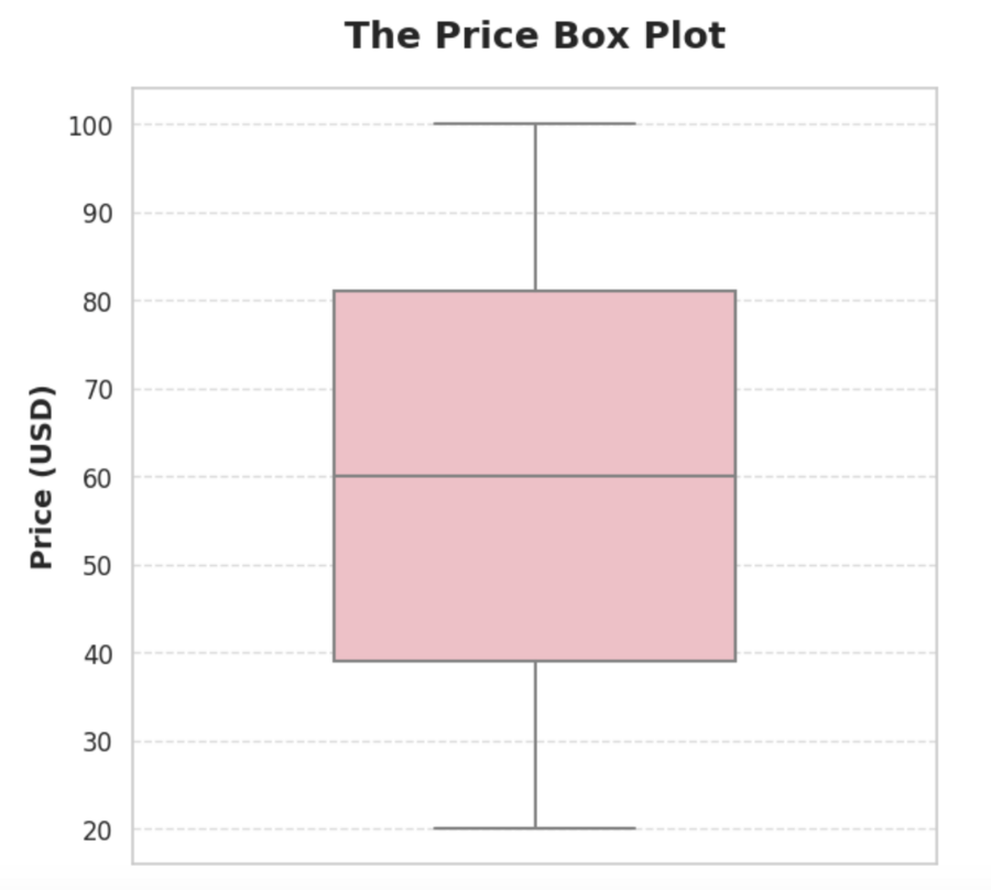 Диаграмма размаха показывает распределение цен в USD, где медиана находится около 60. Большая часть данных (межквартильный размах) сосредоточена между 50 и 80, что указывает на значительную вариативность цен внутри этого диапазона. Верхняя и нижняя усы означают наличие более высоких и низких цен, соответственно. Это может свидетельствовать о разнообразии ценовых категорий в наборе данных.