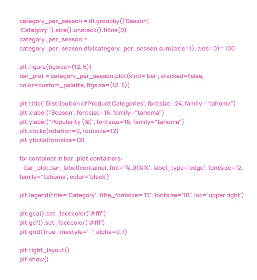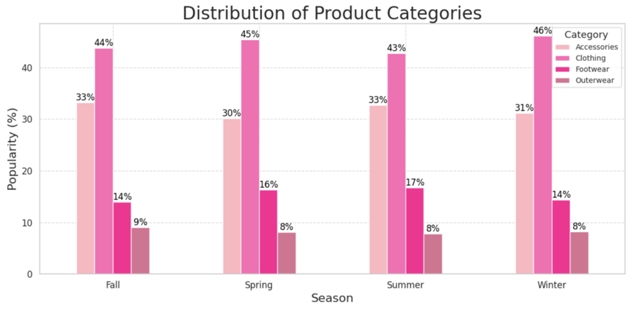 График показывает, что одежда является наиболее популярной категорией в любой сезон, занимая лидирующие позиции. Аксессуары тоже демонстрируют значительную популярность, особенно в зимний и осенний сезоны. Обувь и верхняя одежда значительно менее популярны и варьируются незначительно в зависимости от сезона.