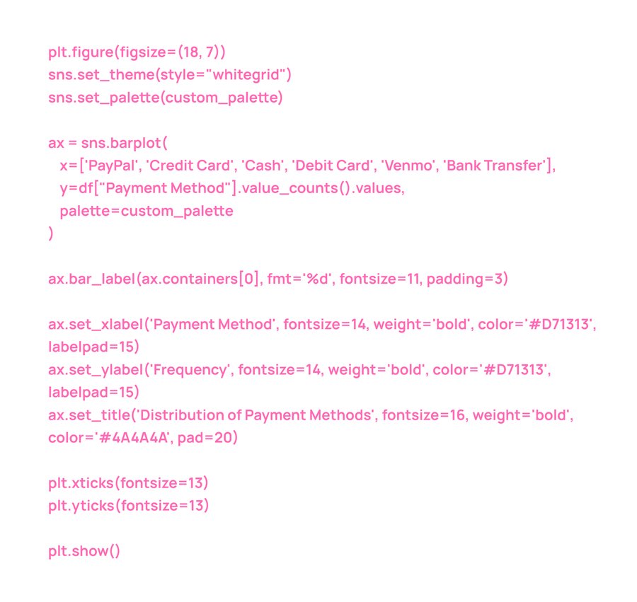 Диаграмма показывает, что PayPal является самым популярным методом оплаты с 677 случаями, за ним следуют кредитные карты (671) и наличные (670). Хотя различия небольшие, дебетовые карты (636), Venmo (634) и банковские переводы (612) встречаются реже. Это может свидетельствовать о предпочтении более традиционных и широко используемых методов оплаты среди пользователей.